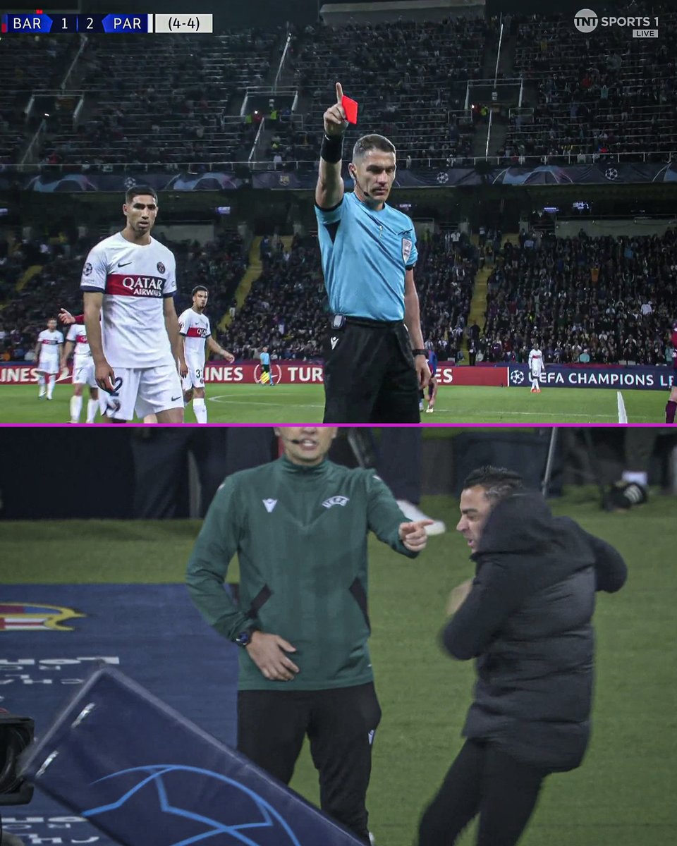 Apoi, în minutul 56, Kovacs l-a eliminat pe Xavi, antrenorul Barcelonei, pentru că a avut o criză de nervi, în care a lovit cu piciorul un panou publicitar.