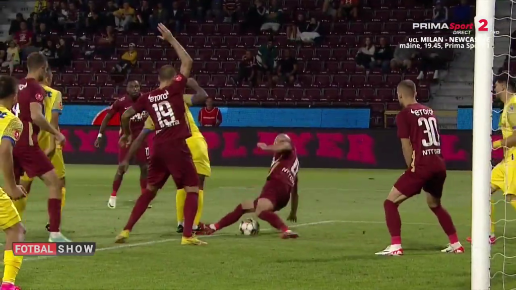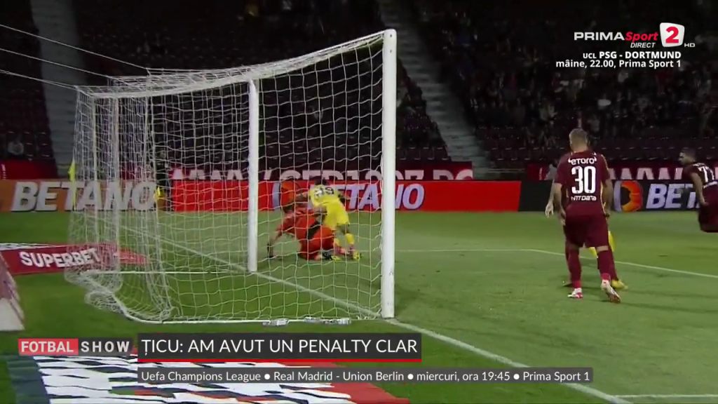 Mai întâi, în minutul 32, Sava l-a oprit în careu pe Musi. Kovacs n-a dat nimic, deși fotbalistul împrumutat de FCSB la Petrolul a fost lovit cu piciorul de goalkeeperul ceferist. Horia Mladinovici, aflat în camera VAR, n-a reacționat nici el.