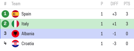 Italia a învins-o pe Albania, 2-1. Pentru Italia au marcat Bastoni și Barella, în timp ce unica reușită a Albaniei a fost semnată de Bajrami, în secunda 23, fiind cel mai rapid gol de la un Campionat European.