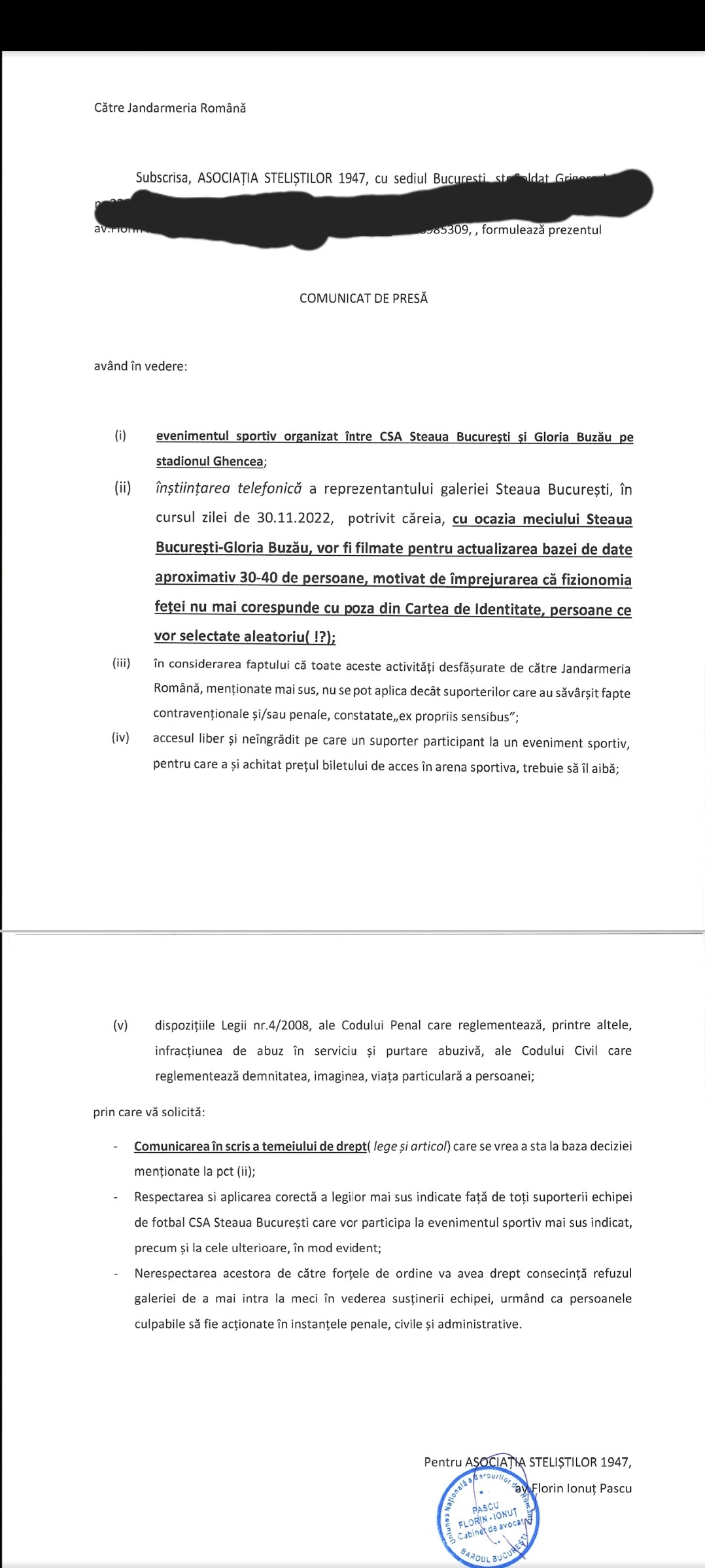 De data asta, conform celor menționate de Asociația Steliștilor 1947 VEZI FOTO), demersul jandarmilor sună cam așa: „Cu ocazia meciului Steaua București – Gloria Buzău, vor fi filmate, pentru actualizarea bazei de date, aproximativ 30-40 de persoane, motivat de împrejurarea că fizionomia feței nu mai corespunde cu poza din Cartea de Identitate, persoane ce vor fi selectate aleatoriu”, punctează avocatul AS 47, printr-un comunicat de presă, prin intermediul căruia consideră drept abuz mișcarea anunțată și pregătită de jandarmi.