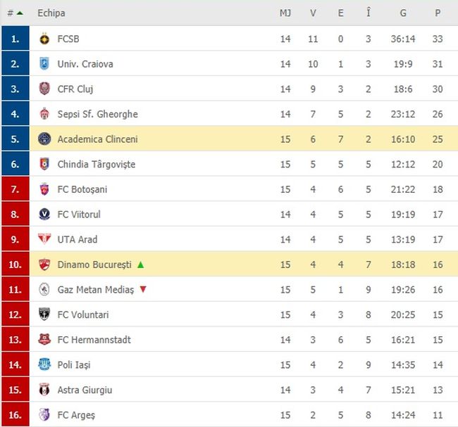 Dinamo încheie turul de campionat pe locul 10, cu 16 puncte.