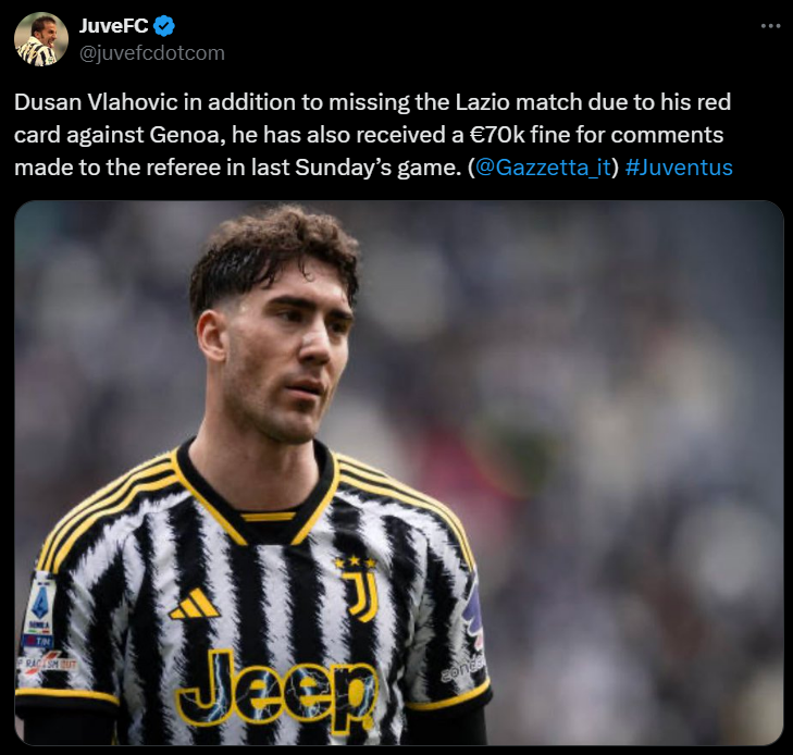 Această eliminare îl va costa scump pe Vlahovic. Juventus nu se va putea baza pe atacant în meciul viitor, în deplasarea de pe Olimpico unde vor juca împotriva lui Lazio. „Bătrana doamnă” va avea un singur atacant disponibil, pe Moise Kean, întrucât Vlahovic este suspendat și Milik este accidentat. Conducerea lui Juventus a decis să-l amendeze pe sârb cu 70 de mii de euro după cartonașul roșu primit în meciul cu Genoa.