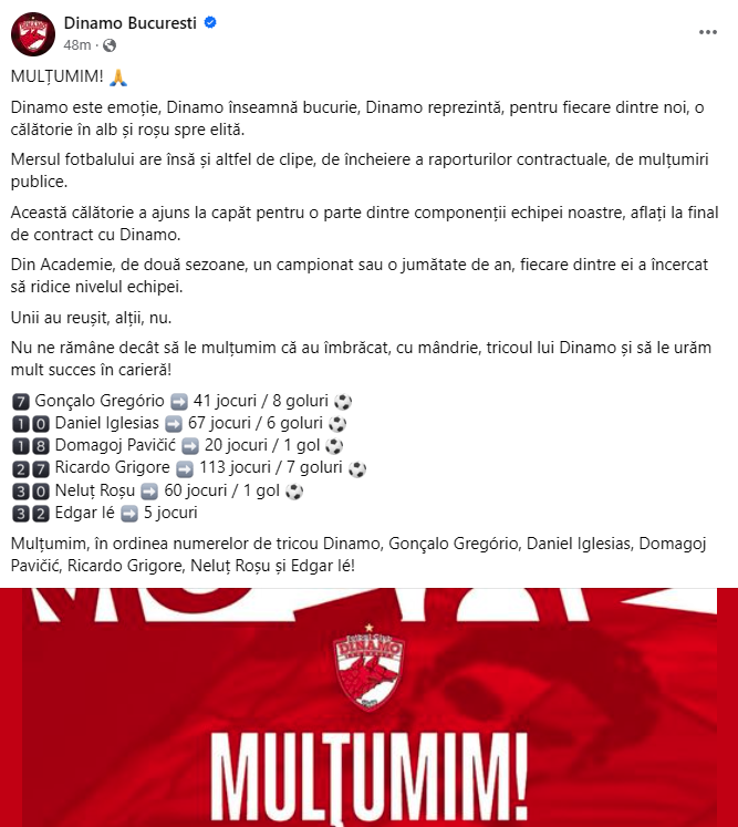 Nu ne rămâne decât să le mulțumim că au îmbrăcat, cu mândrie, tricoul lui Dinamo și să le urăm mult succes în carieră!”, se arată în comunicatul emis de Dinamo.