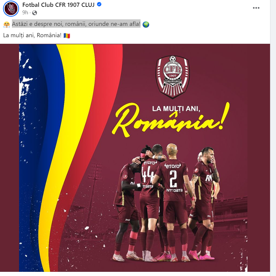 „Astăzi e despre noi, românii, oriunde ne-am afla!”, a transmis CFR Cluj, tot în mediul online, alături de o imagine cu elevii lui Andrea Mandorlini și, evident, un tricolor.