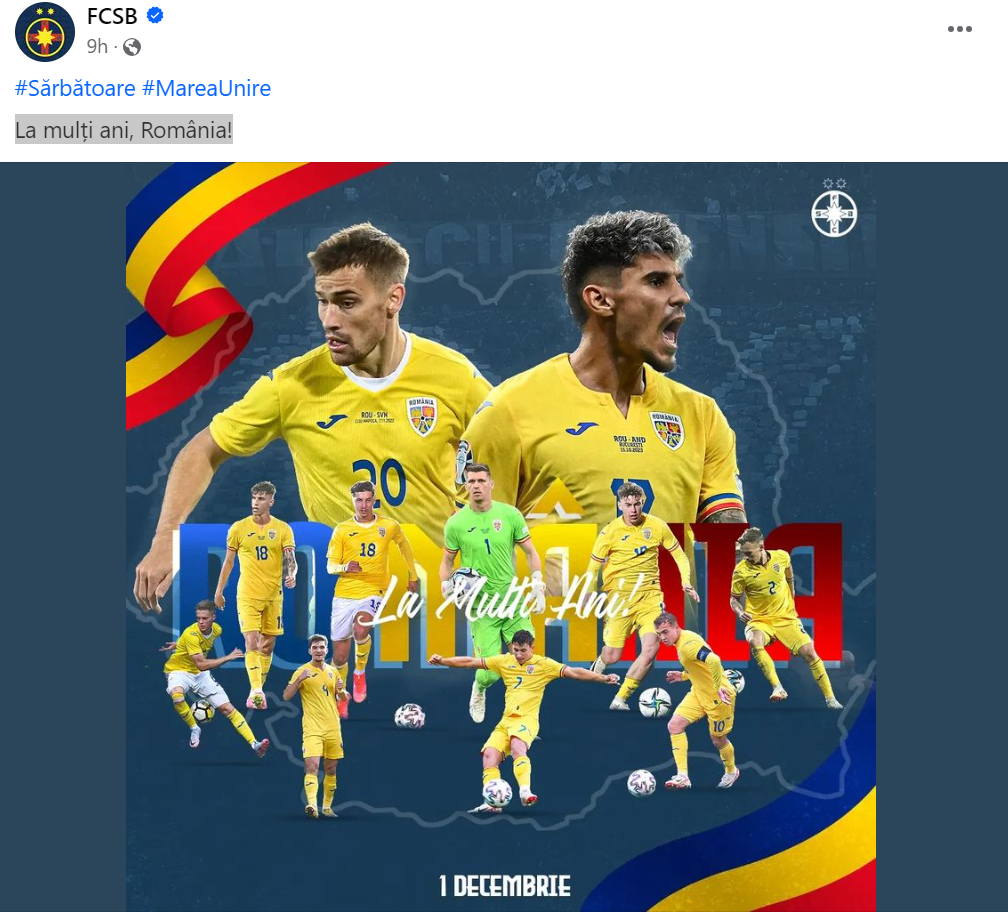 Roș-albaștrii au fost cei care au dat tonul, printr-o fotografie cu Florinel Coman, Darius Olaru, Octavian Popescu și ceilalți jucători care evoluează la loturile naționale. „La mulți ani, România!”, a fost mesajul care a însoțit postarea.