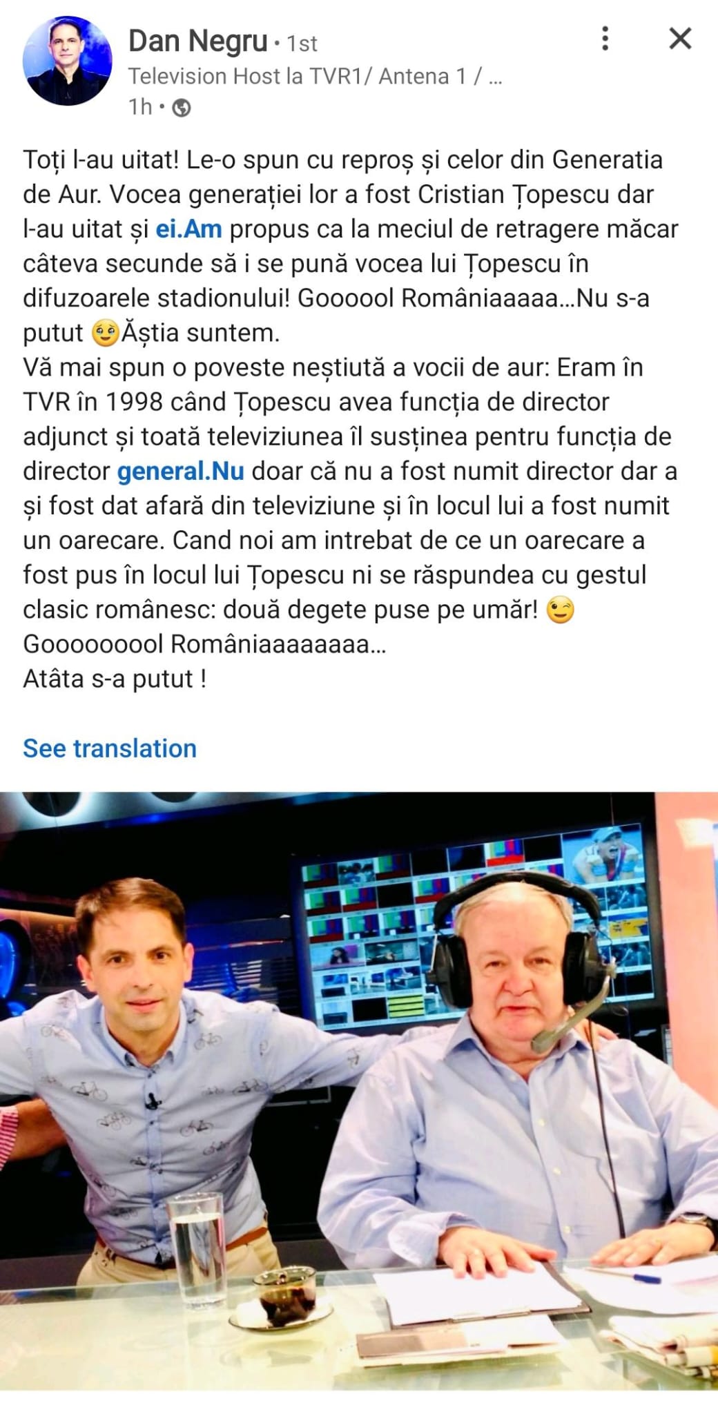 Realizatorul TV Dan Negru a postat pe LinkedIn un mesaj în care sancționează omiterea lui Cristian Țopescu din programul galei. Negru ar fi vrut ca vocea lui Țopescu, unul dintre cei mai mari comentatori din istoria României, să se audă pe stadion, la fel cum s-a întâmplat în Statele Unite, la Mondialul din urmă cu 30 de ani. Țopescu a fost prima voce a TVR la turneul final din America.