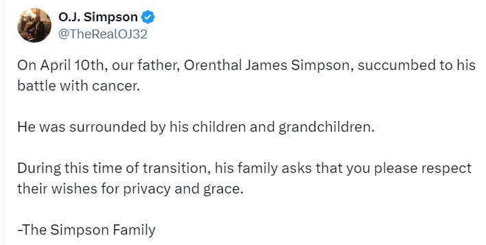 „Pe 10 aprilie, tatăl nostru, Orenthal James Simpson, a pierdut lupta cu cancerul. A fost înconjurat de copiii și nepoții săi. În acest moment de tranziție, familia sa vă roagă să respectați dorința lor de intimitate și grație”, se arată în declarație.