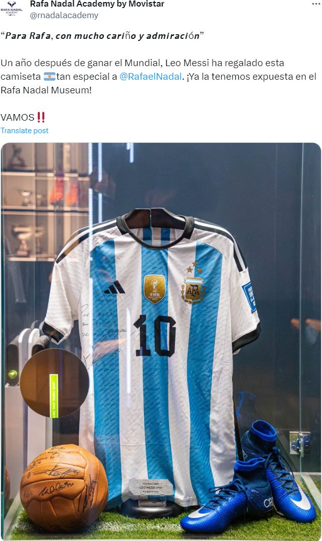 „La un an de la câştigarea Cupei Mondiale, Leo Messi a dăruit acest tricou cu totul special. Îl avem deja expus”, a transmis deținătorul a 22 de titluri de Mare Slam. În muzeul său se află, totodată, tricoul baschetbalistului Michael Jordan, pantofii sprinterului Usain Bolt, casca pilotului Sebastian Vettel, crosele jucătorului de golf Tiger Woods, ghetele fotbalistului Cristiano Ronaldo, dar și combinezonul înotătorului Michael Phelps.