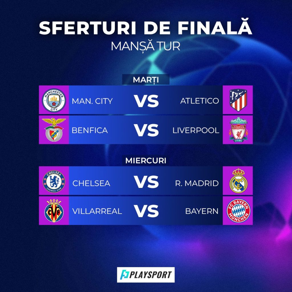 Partidele din sferturi Benfica – Liverpool și Manchester City – Atletico Madrid vor putea fi urmărite în format live score pe site-ul Playsport.ro.