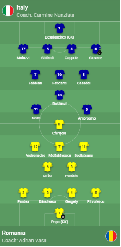 Min. 17: Alexandru Pantea a respins de pe linia porții lovitura de cap trimisă de Casadei în urma unui corner, faza a continuat, iar apărarea României a acordat un nou corner.