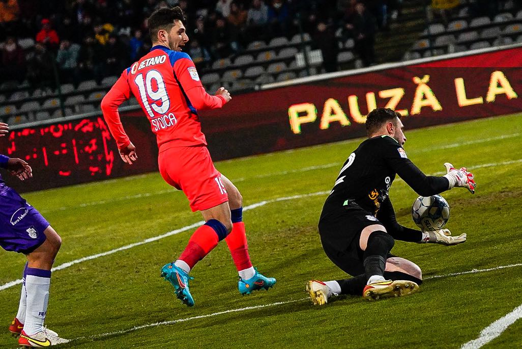 Min. 85: Ocazie uriașă ratată de FCSB. Keșeru l-a lăsat pe Florinel Coman singur cu Greab, dar acesta a șutat slab cu piciorul stâng, iar portarul piteștenilor a resping excelent cu piciorul.