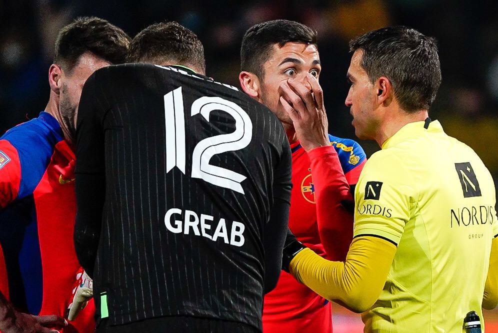 Min. 50: Lovitură liberă indirectă pentru FCSB din marginea careului de 16 metri, după ce portarul Greab a prins din nou mingea, pe care inițial a vrut să o arunce la un coechipier.
