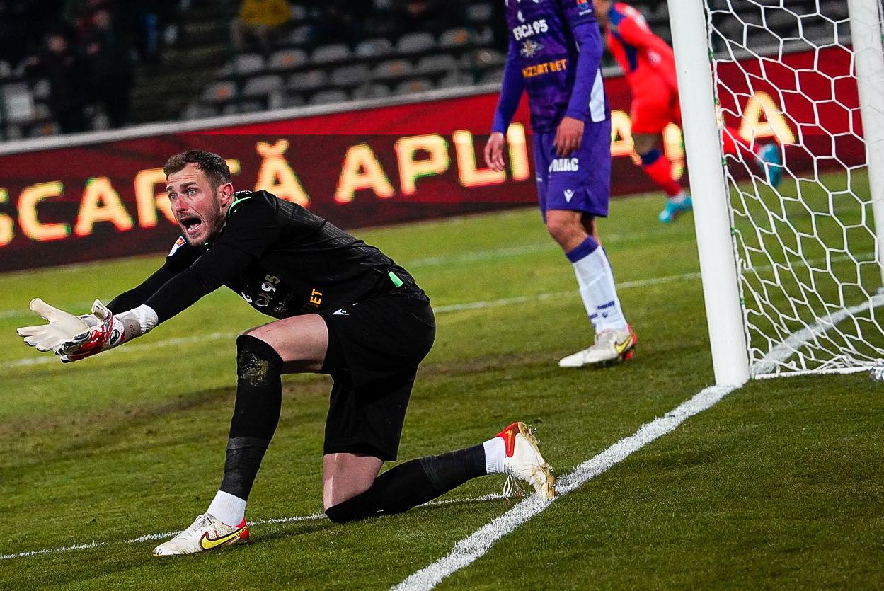Min. 27: Ocazie uriașă pentru FCSB. Tofan a respins din fața liniei porții șutul trimis de Dumiter. Roș-albaștrii au cerut o lovitură de la 11 metri pentru un henț, dar Ovidiu Hațegan a acordat doar corner.