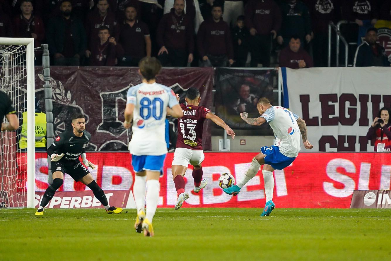 Min. 2: Denis Alibec are o incursiune bună pe partea stângă și centrează în careul giuleștean. Faza este întreruptă pentru o poziție de ofsaid la Grameni;