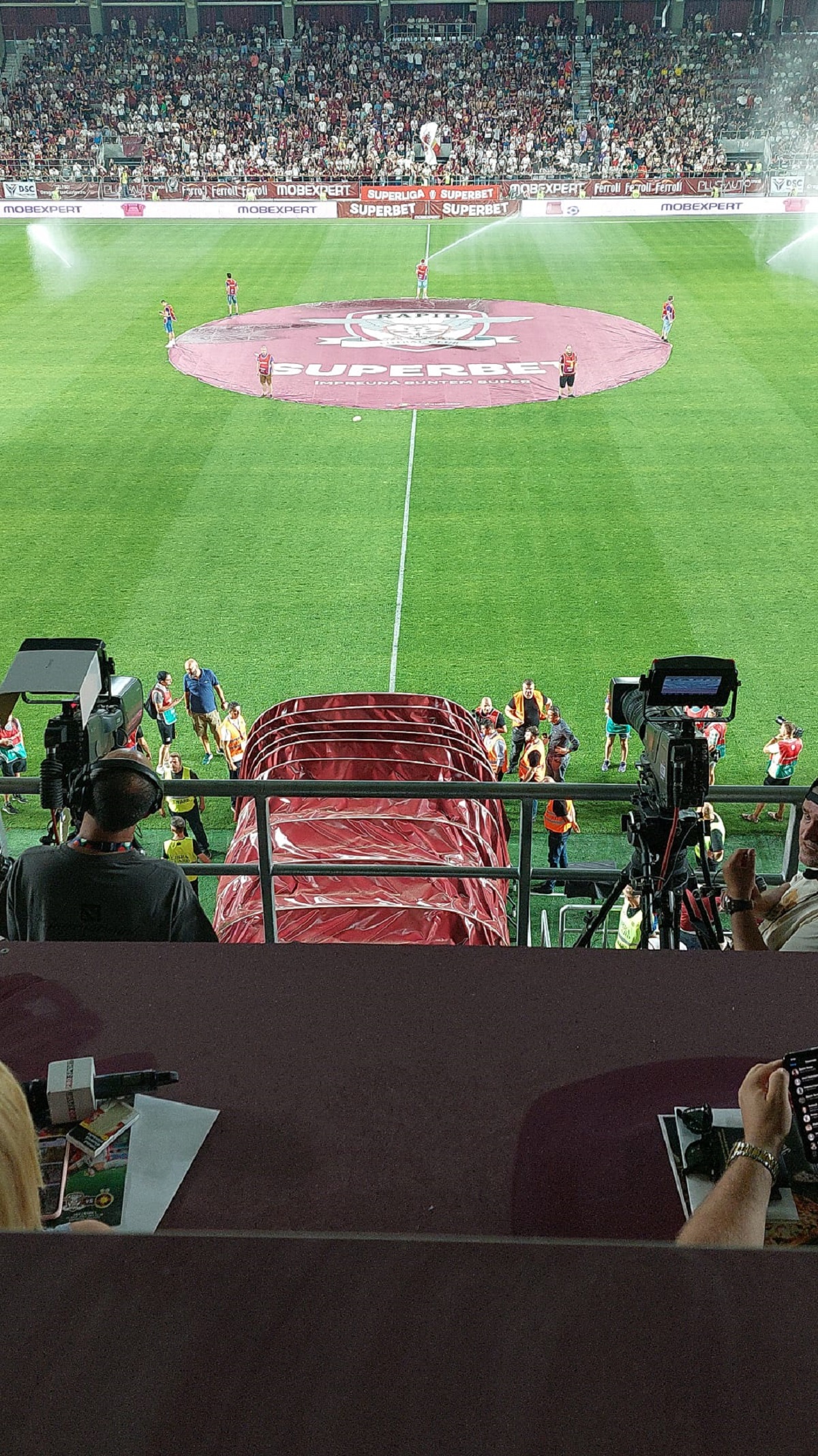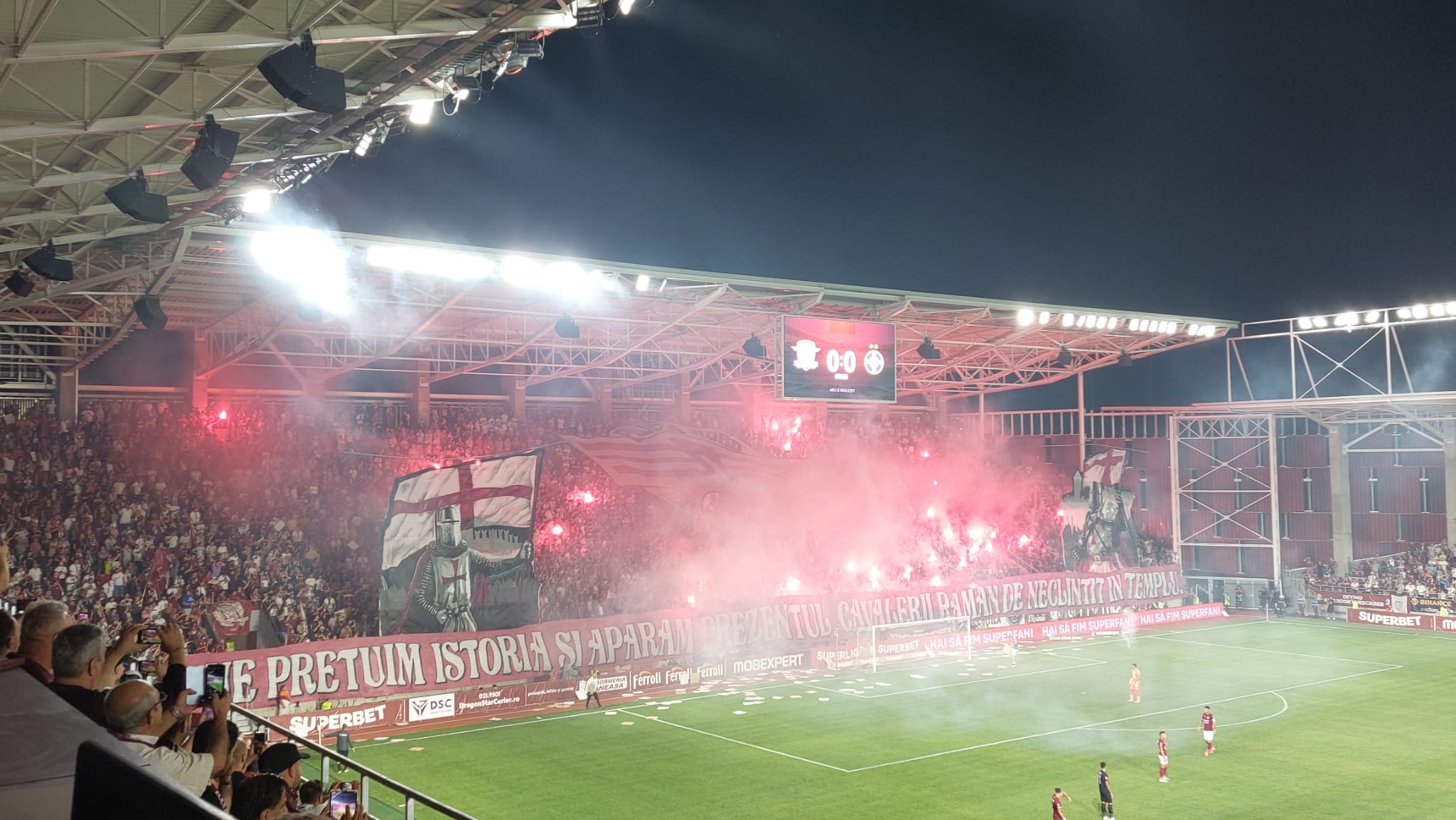 Min. 6: Replica fanilor Rapidului nu a întârziat să apară. Ei au desfășurat o coregrafie pe întreaga peluză Nord și au aprins multe torțe. Unele dintre ele au ajuns și pe gazon, iar Istvan Kovacs a oprit din nou meciul.