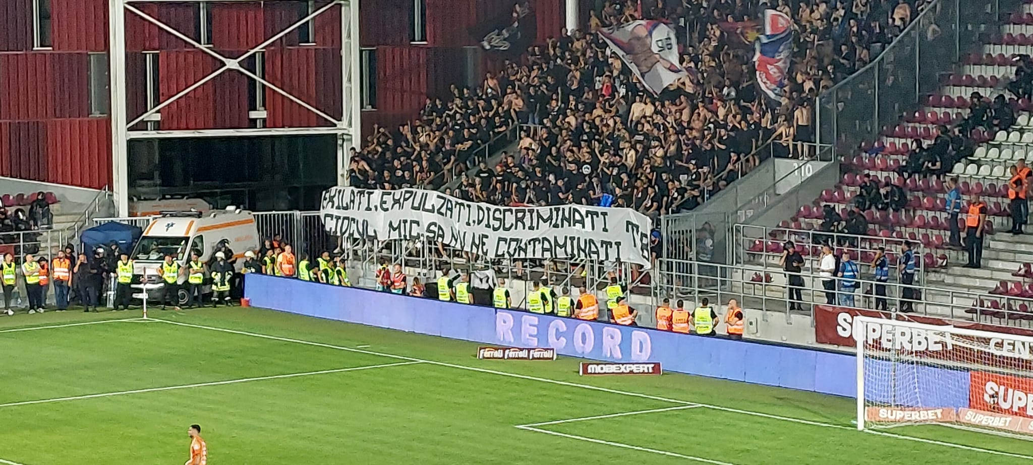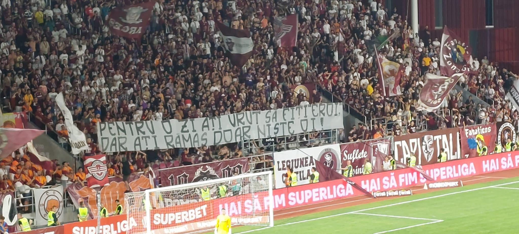 Continuă duelul galeriilor. Mesaje afișate aproape în același timp de cele două peluze. „Pentru o zi ați vrut să fiți eroi, dar ați rămas doar niște oi” – Peluza Nord Rapid/ „Exilați, expulzați, discriminați, ciocul mic să nu ne contaminați” – Peluza Nord FCSB.