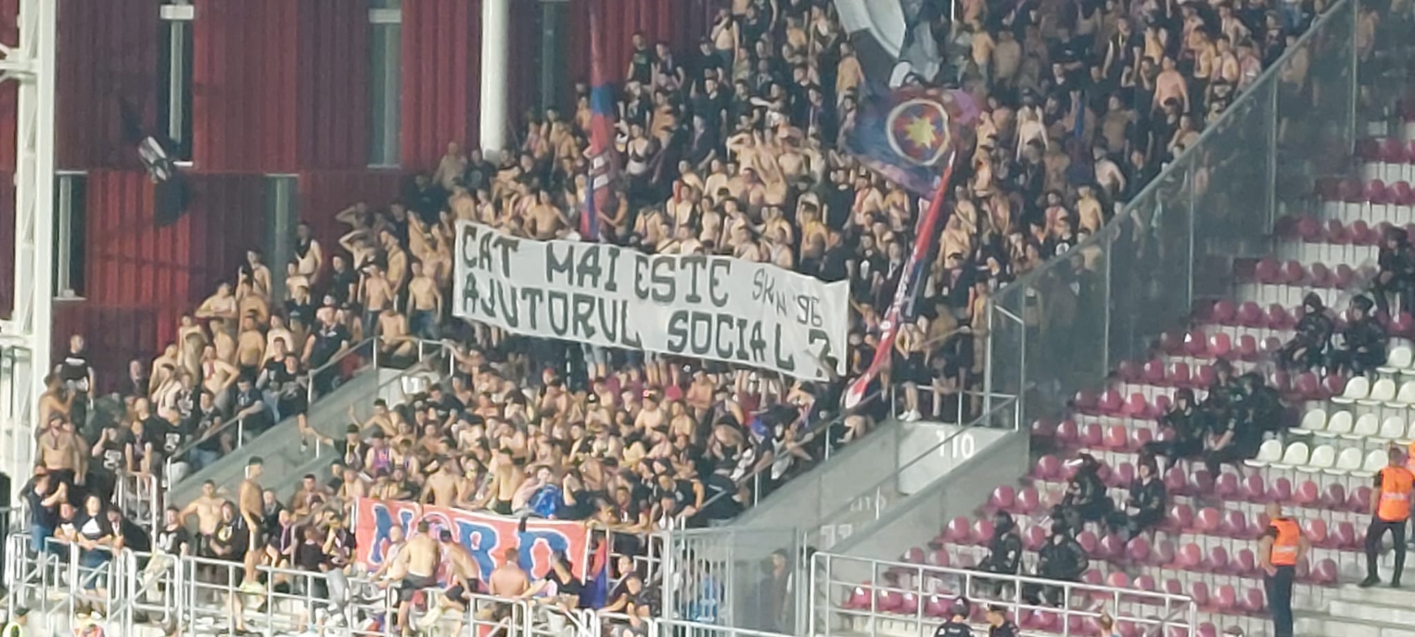 „Cât mai este ajutorul social?”, mesaj afișat de fanii oaspeți.