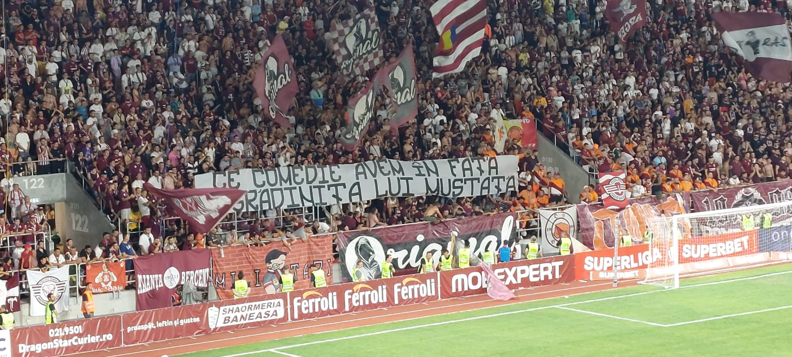 „Ce comedie avem în față/ Grădinița lui Mustață”, mesaj afișat de Peluza Nord Rapid.