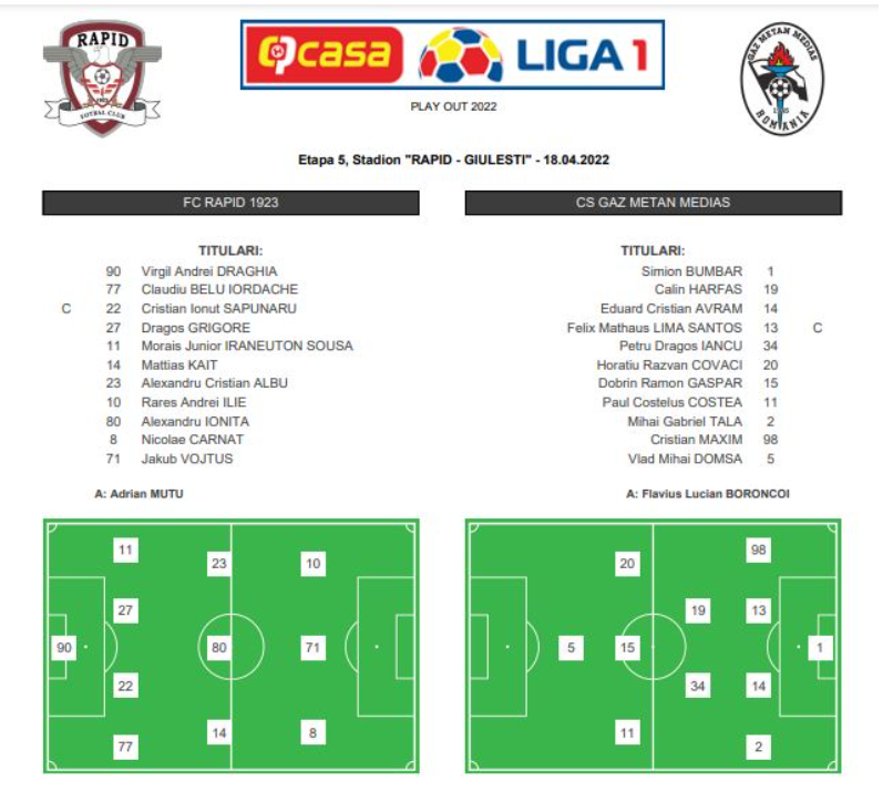 Meciul dintre Rapid și Gaz Metan Mediaş se va desfășura luni, 18 aprilie, de la ora 20:30, în cadrul etapei a 5-a din play-out-ul Casei Pariurilor Liga 1. Este o confruntare importantă, între principala favorită la câştigarea play-out-ului şi echipa care continuă să fie depunctată din cauza neachitării datoriilor salariale.