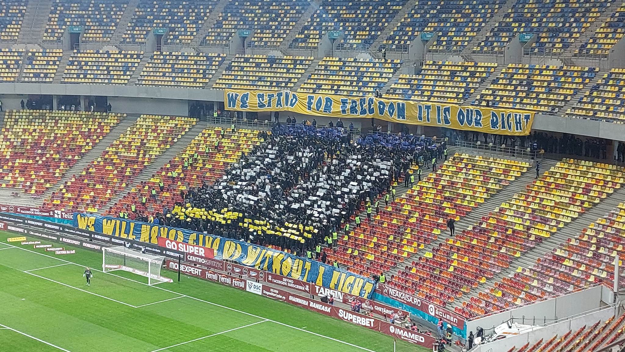 INFO. Sectorul destinat oaspeților este plin. Fanii „lupilor galbeni” au afișat o coregrafie și au scandat „libertate pentru suporteri”.