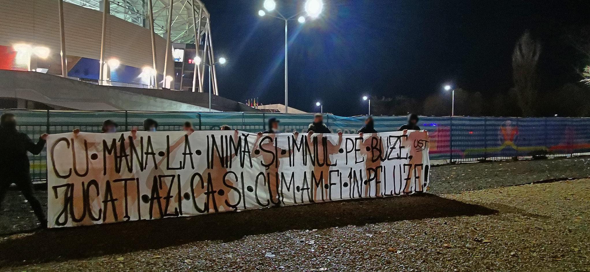 INFO: Câțiva suporteri au ținut să fie prezenți la stadion, chiar dacă porțile au fost închise. Aceștia au afișat un mesaj pentru naționala lui Mirel Rădoi. „Cu mâna la inimă și imnul pe buze, jucați azi ca și cum am fi în peluze”.