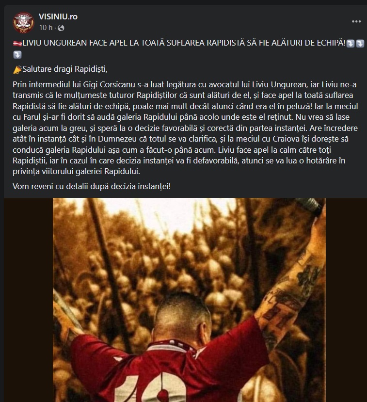 Într-o vreme de incertitudine pentru galeria celor de la Rapid, liderul acesteia, Liviu Ungurean, cunoscut sub numele de Bocciu, a transmis un mesaj mobilizator. Acesta a fost arestat preventiv, dar spiritul său rămâne neclintit.