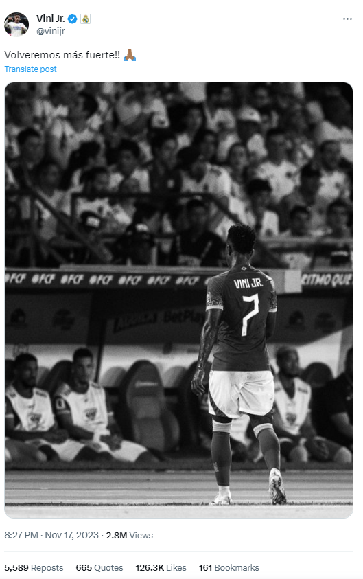 „Ne vom întoarce mai puternici”, a postat Vinicius Jr pe conturile sale de socializare vineri.