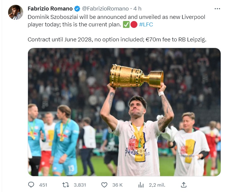 Liverpool plătește o sumă uriașă, nu mai puțin de 70 de milioane de euro, pentru a-l aduce pe maghiar de la RB Leipzig. Conform jurnalistului specializat în mercato Fabrizio Romano, anunțul oficial din partea lui Liverpool ar putea veni chiar astăzi. Acordul despre total între club și fotbalist, care va semna până în 2028.