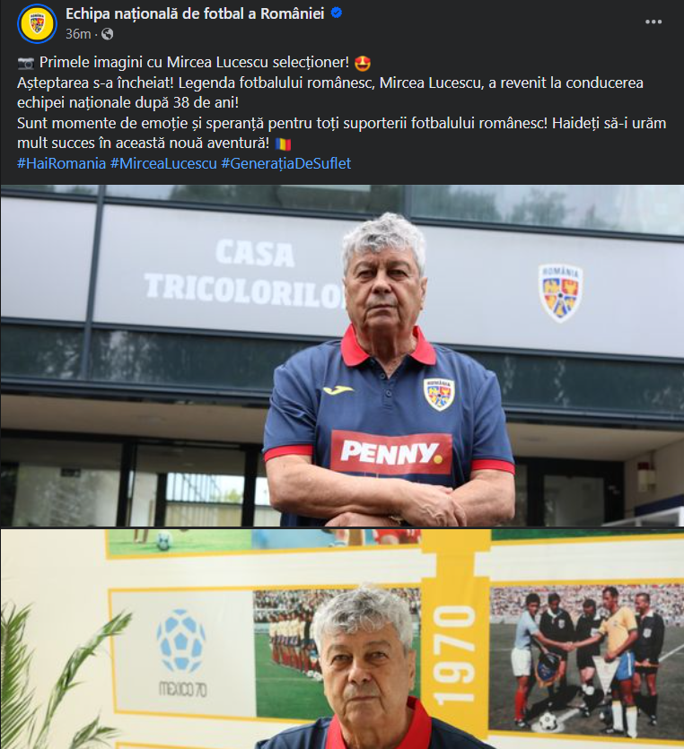 „Așteptarea s-a încheiat! Legenda fotbalului românesc, Mircea Lucescu, a revenit la conducerea echipei naționale după 38 de ani! Sunt momente de emoție și speranță pentru toți suporterii fotbalului românesc! Haideți să-i urăm mult succes în această nouă aventură!”