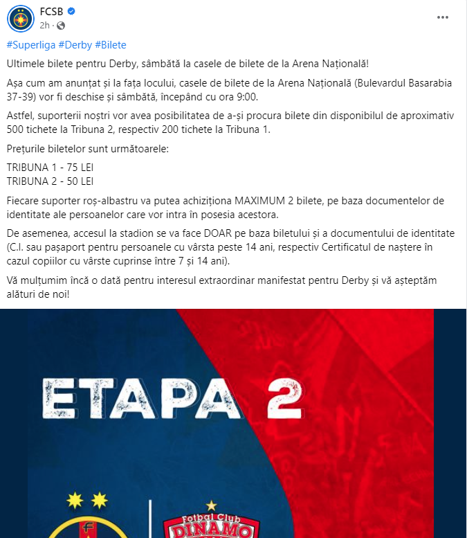 Fiecare suporter roș-albastru va putea achiziționa MAXIMUM 2 bilete, pe baza documentelor de identitate ale persoanelor care vor intra în posesia acestora”, se arată în comunicatul emis de FCSB.