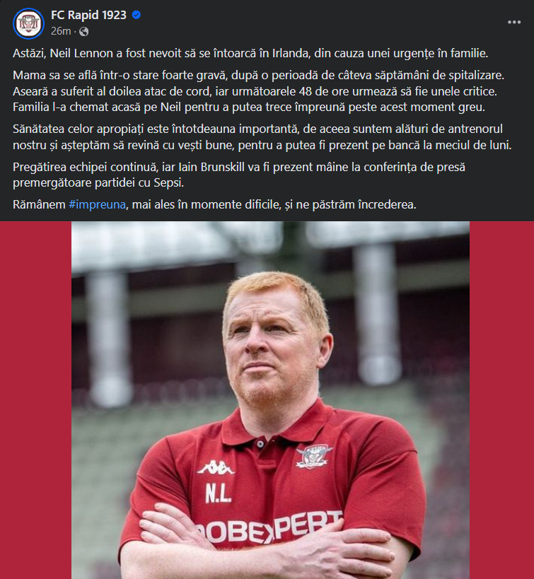 Rapid a emis un comunicat când Neil Lennon a plecat din România, explicând situația critică a mamei sale: ”Astăzi, Neil Lennon a fost nevoit să se întoarcă în Irlanda, din cauza unei urgențe în familie. Mama sa se află într-o stare foarte gravă, după o perioadă de câteva săptămâni de spitalizare. Aseară a suferit al doilea atac de cord, iar următoarele 48 de ore urmează să fie unele critice. Familia l-a chemat acasă pe Neil pentru a putea trece împreună peste acest moment greu.