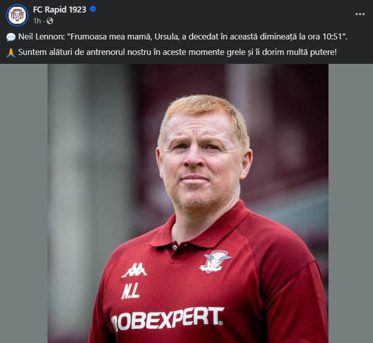 Într-o postare plină de durere, Neil Lennon a informat publicul despre pierderea suferită: „Frumoasa mea mamă, Ursula, a decedat în această dimineață la ora 10:51”. Antrenorul Rapidului a plecat de urgență din România sâmbătă, 3 august, pentru a fi alături de mama sa în ultimele momente.