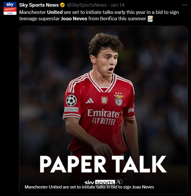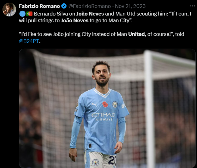 „Nu știu dacă zvonurile sunt adevărate, dar știu că Neves este pregătit pentru un salt mare. Este un jucător excelent, a ajuns la echipa națională. Din acest motiv, marile cluburi sunt cu ochii pe el”, a spus Bruno Fernandes despre conaționalul său, Joao Neves. Bernardo Silva, de asemenea fost jucător în academia Benficăi, a sugerat cu un zâmbet ironic reporterilor în cadrul unui eveniment că și-l dorește pe Neves la City.