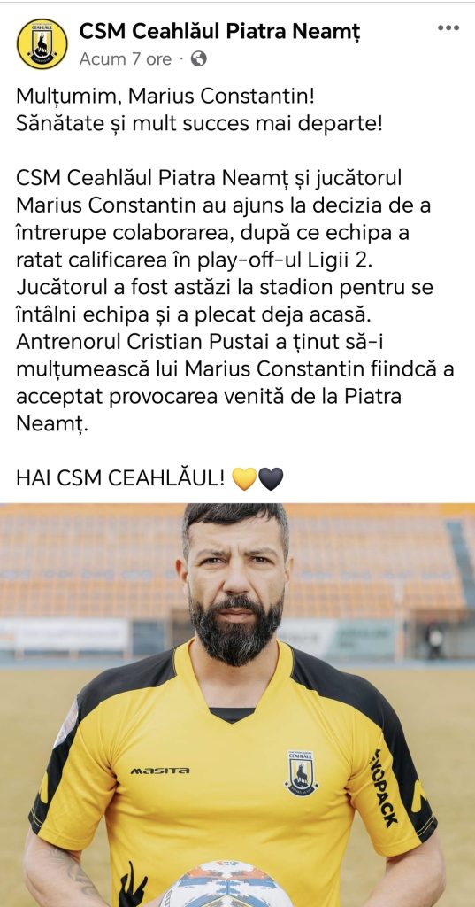 „Mulțumim, Marius Constantin! Sănătate și mult succes mai departe! CSM Ceahlăul Piatra Neamț și jucătorul Marius Constantin au ajuns la decizia de a întrerupe colaborarea, după ce echipa a ratat calificarea în play-off-ul Ligii 2. Jucătorul a fost astăzi la stadion pentru se întâlni cu echipa și a plecat deja acasă.