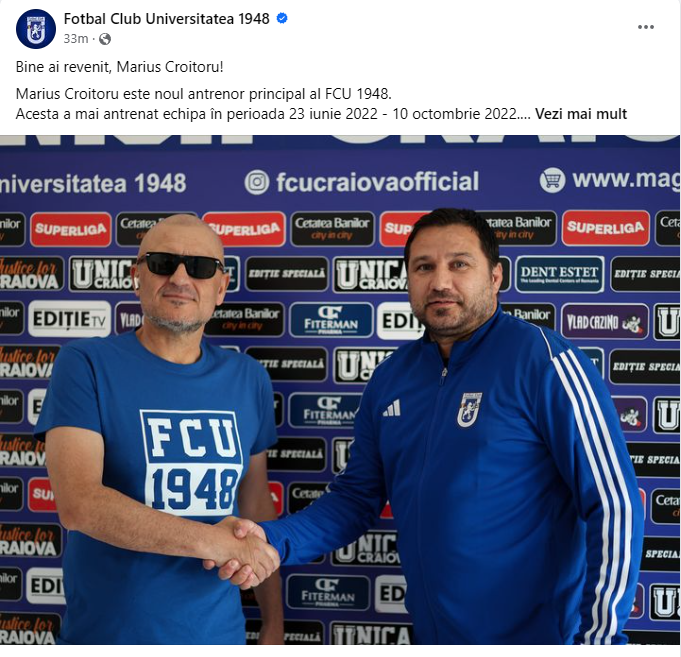 Marius Croitoru este noul antrenor principal al FCU 1948. Acesta a mai antrenat echipa în perioada 23 iunie 2022 – 10 octombrie 2022.