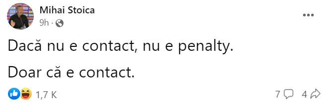 Iar unii dintre ei au ajuns la concluzia că penaltyul a fost uşor acordat, având în vedere că între cei doi fotbalişti nu există un contact evident care să provoace căderea lui Şut. Din peisaj nu putea lipsi şi Mihai Stoica. Obişnuit pentru postările pe care le face destul mai des mai ales după meciurile propriei sale echipe, Meme nu s-a abţinut nici acum şi a intrat în „horă”.