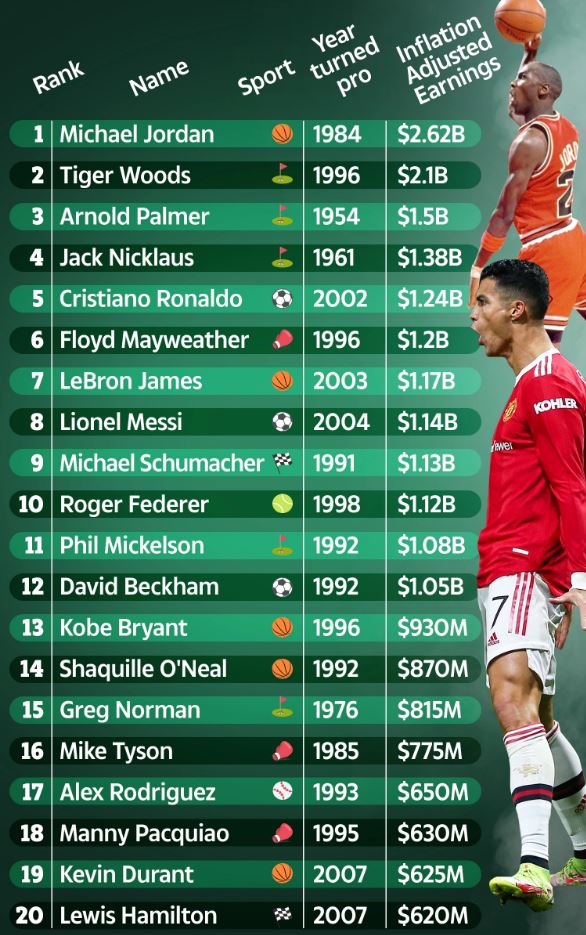 Atunci când vine vorba despre cei mai bogați sportivi din toate timpurile, Messi și Ronaldo se uită încă de jos la câștigurile lui Michael Jordan, fostul baschetbalist de legendă din NBA.