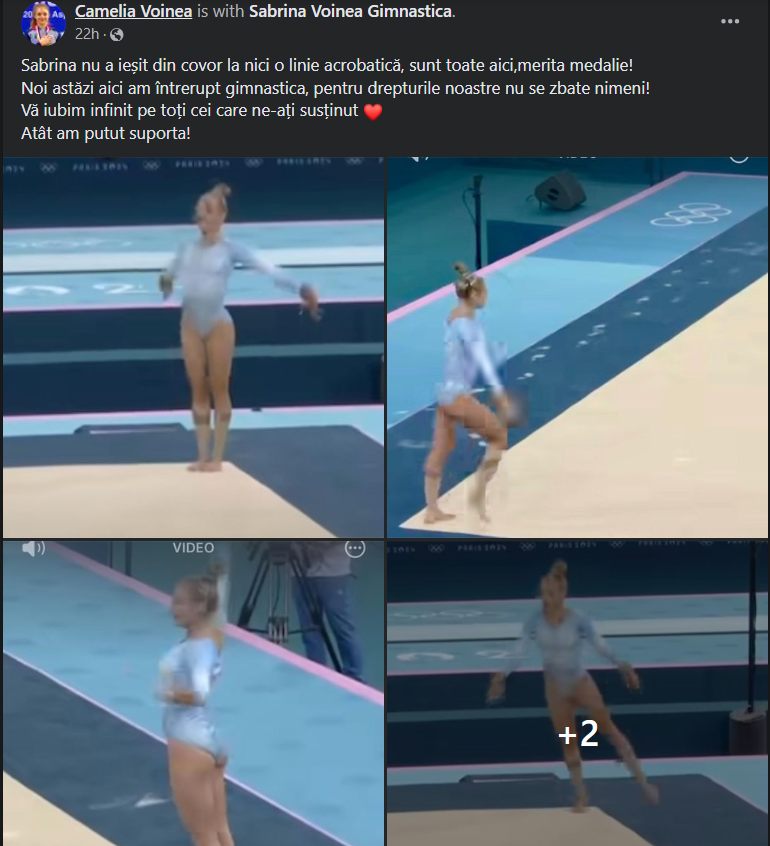 Camelia Voinea a criticat și încercările Federației Române de Gimnastică de a contesta nota americancei Jordan Chiles, subliniind că acest lucru nu este permis. Ea a evidențiat faptul că nimeni nu a luat în considerare penalizarea de 0,1 puncte aplicată Sabrinei: