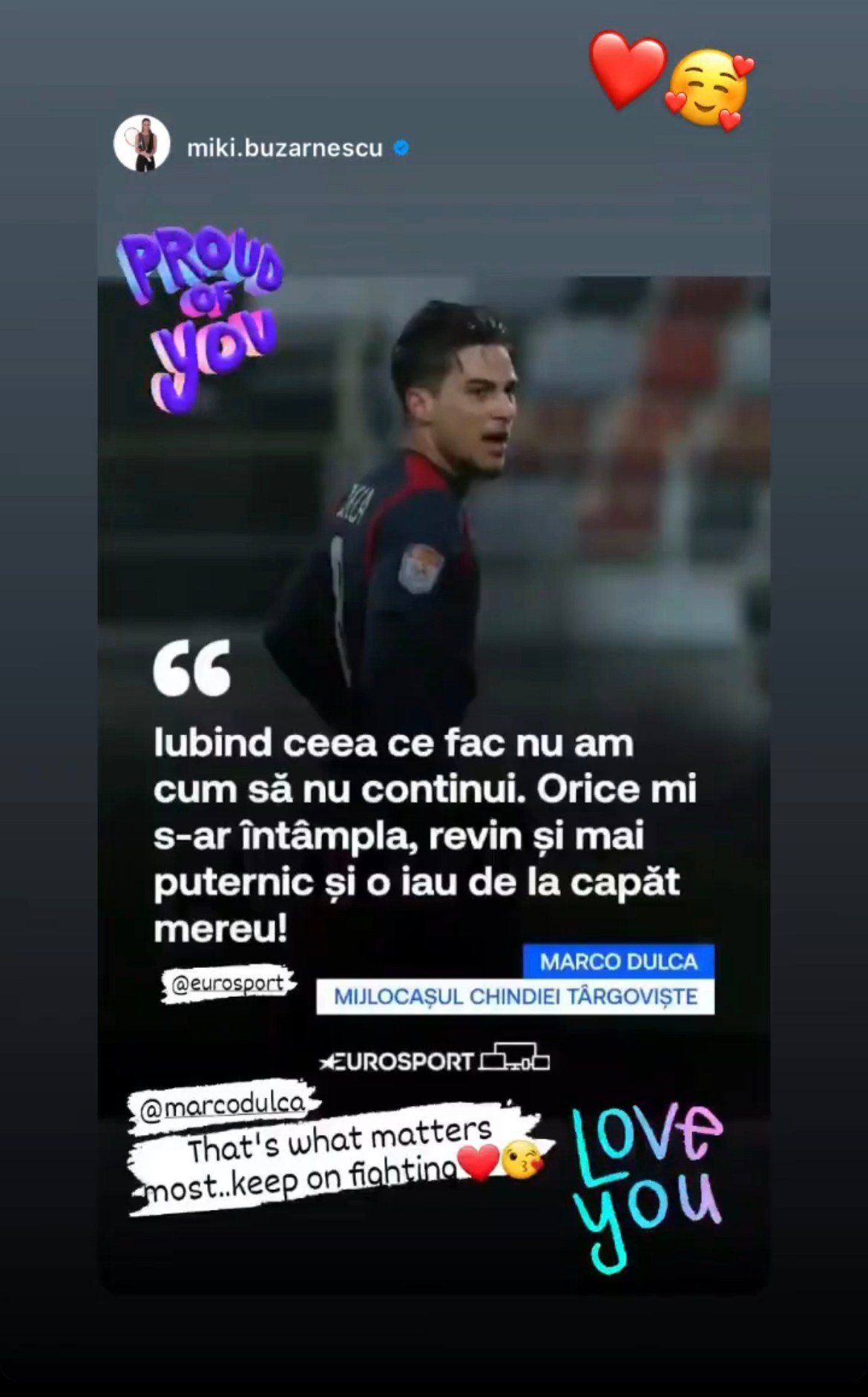 Mihaela Buzărnescu (33 de ani) este îndrăgostită până peste cap de Marco Dulca (22 de ani). Cei doi nu ratează nicio ocazie pentru a-și arăta sentimentele, fie și prin intermediu rețelelor de socializare. De această dată, jucătoarea de tenis este cea care i-a făcut o declarație de iubire publică fotbalistului legitimat la Chindia Târgoviște.