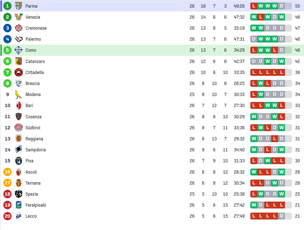 Deși a făcut un pas greșit, Parma este în continuare principala favorită la promovare. Asta pentru că domină clasamentul din Serie B, cu 55 de puncte și 7 avans față de Venezia.