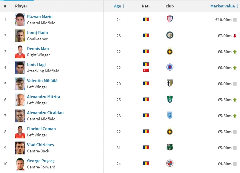 Fiul „Regelui” împarte poziția a patra a clasamentului cu Valentin Mihăilă de la Parma – câte șase milioane. Curios, mijlocașul celor de la Slavia Praga, Nicolae Stanciu, se află doar pe poziția a 11-a în topul fotbaliștilor români. Cota sa a scăzut mult în ultimii ani. De la 8 milioane în octombrie 2016, la 4,5 milioane de euro acum. De asemenea, Alexandru Maxim este pe 15, cu 2,6 milioane de euro, iar Denis Alibec peste pe locul 25, cu 1,8 milioane de euro.