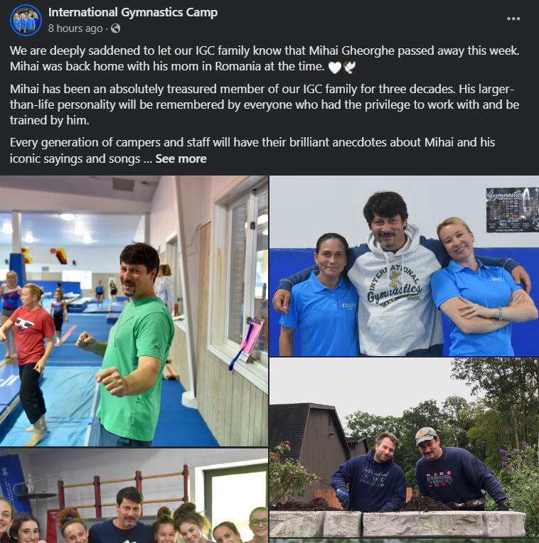 „Suntem profund întristați să anunțăm familiei noastre CIG că Mihai Gheorghe s-a stins din viață în această săptămână. Mihai s-a întors acasă cu mama lui în România la acea vreme (n.r. in comuna Aninoasa, judetul Gorj). Mihai este un membru absolut prețuit al familiei noastre IGC de trei decenii. Personalitatea lui mai mare decât viața va fi amintită de toți cei care au avut privilegiul de a lucra cu el și de a fi instruiți de el.”, se arată în postarea Taberei Internaționale de Gimnastică, pe Facebook.