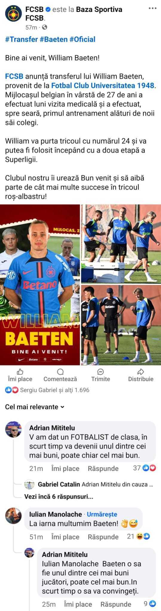 Adrian Mititelu, patronul celor de la FCU Craiova, a vorbit în termeni laudativi despre mijlocașul belgian și recunoaște că acesta va avea mai multe oportunități la campioana României. Mititelu l-a lăudat pe fostul său jucptor și pe pagina de facebook al celor de la FCSB, acolo unde roș-albaștrii au anunțat transferul lui Baeten. ”V-am dat un fotbalist de clasă, în scurt timp va deveni unul dintre cei mai buni, poate cel mai bun”, a spus Mititelu.