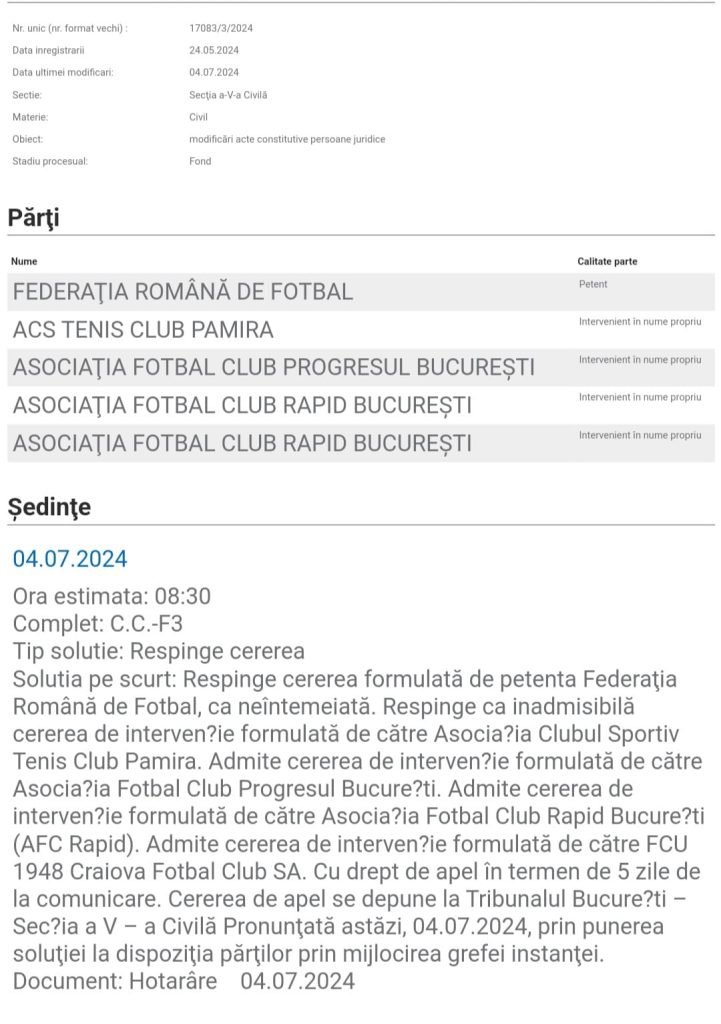 În replică, departamentul juridic al FRF a emis un comunicat prin care a clarificat situația. „Tribunalul București a decis astăzi, într-o primă etapă procesuală, respingerea unei cereri administrative a FRF de actualizare a unor informații dintr-un registru al Tribunalului București. Această decizie este nedefinitivă, FRF formulând deja apel ce va fi judecat de Curtea de Apel București, și oricum lipsită de autoritate de lucru judecat, fiindcă nu privește o dispută, un litigiu, ci o procedură administrativă (necontencioasă). Este lipsit de orice dubiu că FRF funcționează și a funcționat deplin legal. Orice persoană interesată poate verifica în mod simplu veridicitatea acestor afirmații, lecturând mențiunile din Registrul Federațiilor cu privire la Statutul FRF în vigoare, respectiv și mandatul Președintelui FRF. Dezinformările lansate în spațiul public privind ‘funcționarea ilegală a Federației’, ‘anularea mandatului Președintelui’ etc., reprezintă afirmații factuale false, făcute cu rea-credință, și atrag răspunderea civilă a persoanei care le emite, respectiv propagă fără verificare”.