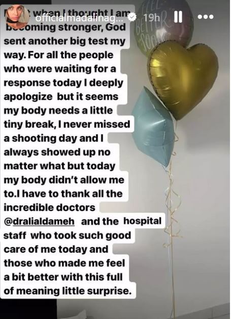 „Chiar când am crezut că devin mai puternică, Dumnezeu mi-a adus un alt test major în cale. Pentru toți care au așteptat un răspuns astăzi, îmi cer mii de scuze, dar corpul meu are nevoie de o mică pauză. Nu am ratat niciodată o zi de shooting și mereu am fost prezentă indiferent de situație, dar astăzi corpul meu nu m-a lăsat. Trebuie să le mulțumesc tuturor medicilor și personalului din spital care au avut atât de multă grijă de mine astăzi și celor care m-au făcut să mă simt puțin mai bine printr-o surpriză plină de semnificație”, a spus Mădălina Ghenea în mesajul postat pe pagina sa de Instagram.