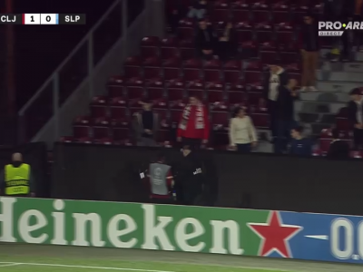 Meciul dintre CFR Cluj și Slavia Praga a fost întrerupt în prima repriză după ce unui fan din tribune i s-a făcut rău. Din primele informații, suporterul a suferit un atac de cord.