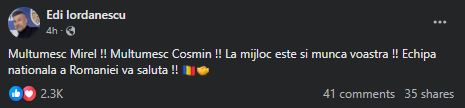 „Mulțumesc, Mirel! Mulțumesc, Cosmin! La mijloc este și munca voastră! Echipa națională a României vă salută!”, a notat Edi Iordănescu pe pagina sa oficială de Facebook.