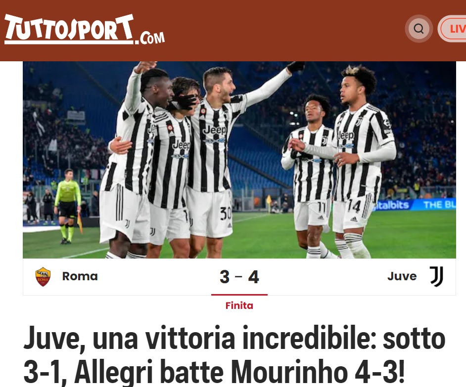 AS Roma a pierdut derby-ul cu Juventus, deși echipa lui Jose Mourinho conducea cu 3-1 încă din minutul 53. Torinezii au declanșat nebunia pe final, atunci când au marcat trei goluri în 7 minute.