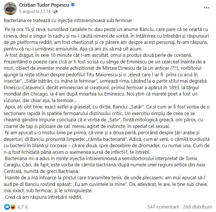 Printr-un mesaj postat pe Facebook și intitulat „Bacteriana se tratează cu injecție intraveninoasă sub fermoar”, cel cunoscut de multă lume drept CTP îl acuză pe Radu Banciu că a scos „două perle” în cele doar 10 minute cât l-a putut asculta.