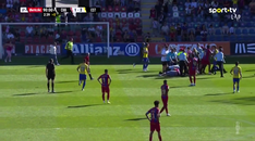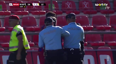 Finalul jocului a fost departe de logica unui meci normal de fotbal. Estoril a terminat partida cu 3 oameni în minus, după incidentele declanșate pe gazon. Mai mulți fani au invadat terenul, iar unul l-a luat la întrebări pe portarul oaspeților, Marcelo Carne. Colegul Pedro Alvaro i-a sărit în ajutor. I-a aplicat o lovitură de kick-boxing, cu genunchiul în figură, suporterului. A urmat o încăierare generală care a dat fotbalul complet la o parte.